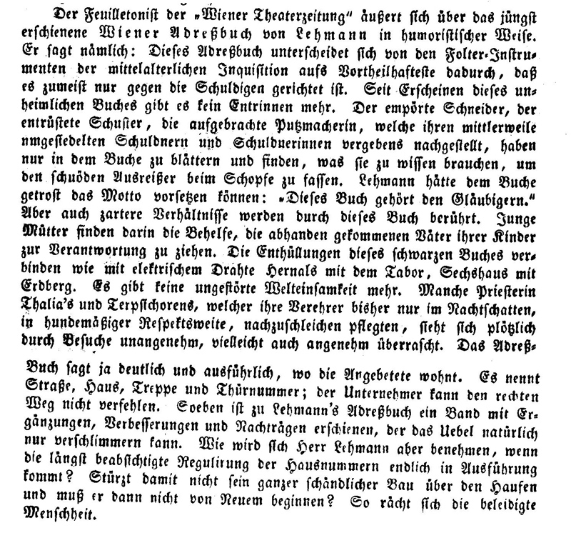 Die Innsbrucker Nachrichten zitierten schon Anfang 1860 (also vor über 160 Jahren) einen Artikel, der im Wiener Theaterjournal die Folgen solcher Verzeichnisse – in Wien war gerade der erste "Lehmann" erschienen – für das Leben in der nun nicht mehr anonymen Großstadt mit Witz und Fantasie beschreibt: